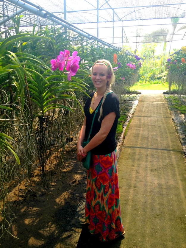 After the market we proceeded to drive out further into the countryside. Once we really got out of the city we arrived at an Orchid Farm. We had the opportunity to learn all about Orchid and the science behind how they mate the flowers to create different species and colors. Did you know Thailand is one of the main suppliers of Orchids in the world? It really was fascinating to learn all about the process from start to finish. Did you know that Orchids are not grown in the ground, but up in the air hanging? We got to take a walk around the farm and while I have always thought Orchids were beautiful flowers, they were just absolutely stunning hanging in rows and rows like that. There were butterflies everywhere and just so much gorgeous vegetation out in the countryside.